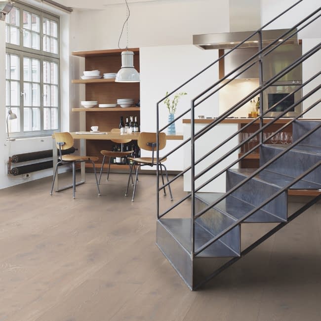 Boen Chaletino Oak Grey Harmony Canyon Brushed Live Pure Lacquer 300mm is a 4 bevel plank which has been brushed to raise the grain and finished with live pure lacquer which is a ultra matt finish with very low sheen so looks unfinished. The grade of the flooring is rustic, will contain larger knots; sapwood and heartwood; a rich spectrum of colours, dead knots are filled with dark brown filler so small gaps between the putty and wood may appear. Colour variation is allowed. The oak engineered flooring comes in fixed lengths which are very long 2750mm, width of the planks is an extra wide 300mm. Total thickness is 15mm which includes the 3.5mm solid oak wear layer. There are 2 boards per pack which covers 1.65m2 and weighs 14kg per pack. Suitable for water-fed underfloor heating. Glue down only. Boen Chaletino Engineered Flooring is made in Europe and has a tongue and groove. PLEASE ALLOW 2 – 3 WEEKS FOR DELIVERY