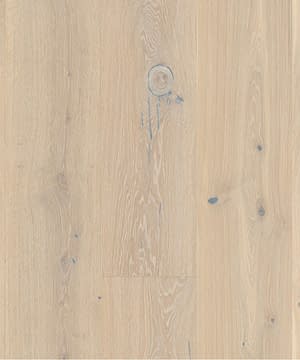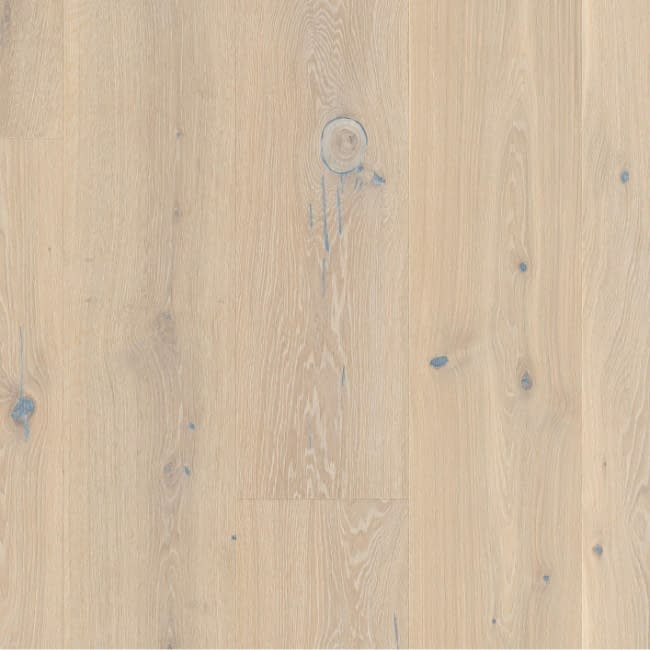 Boen Chaletino Oak Pale White Canyon Brushed Live Pure Lacquer 300mm is a 4 bevel plank which has been brushed to raise the grain and finished with live pure lacquer which is a ultra matt finish with very low sheen so looks unfinished. The grade of the flooring is rustic, will contain larger knots; sapwood and heartwood; a rich spectrum of colours, dead knots are filled with dark brown filler so small gaps between the putty and wood may appear. Colour variation is allowed. The oak engineered flooring comes in fixed lengths which are very long 2750mm, width of the planks is an extra wide 300mm. Total thickness is 15mm which includes the 3.5mm solid oak wear layer. There are 2 boards per pack which covers 1.65m2 and weighs 14kg per pack. Suitable for water-fed underfloor heating. Glue down only. Boen Chaletino Engineered Flooring is made in Europe and has a tongue and groove. PLEASE ALLOW 2 – 3 WEEKS FOR DELIVERY