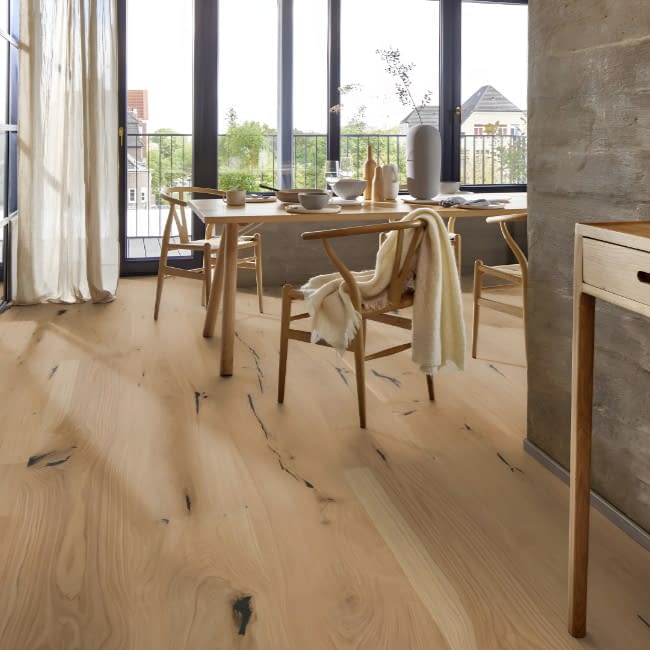 Boen Chaletino Oak Senses Canyon Deep Brushed Live Natural Oil 300mm is a 4 bevel plank has been heavily brushed to raise the grain and finished with live natural oil. The oak engineered flooring comes in fixed lengths which are very long at 2750mm, width of the planks is an extra wide 300mm. Total thickness is 15mm which includes the 3.5mm solid oak wear layer. The oak top layer thickness can fall below 3.5mm caused by the handcrafting. There are 2 boards per pack which covers 1.65m2 and weighs 14kg per pack. Suitable for water-fed underfloor heating. Glue Down Only. Boen have created a new product range where their craftspeople have purposely textured by hand the surface of each floor, creating one of a kind wooden floor. Using the traditional technique their hardwood flooring are finished with Natural Oil and air dried. This way they are perfectly protected and the lively character of the wood is maintained. Cavities, cracks and marks are part of the product and form it’s specific character. The flooring can contain large knots, cracks and filled defects, which have been worked out by hand. Boen Chaletino Engineered Flooring is made in Europe and has a tongue and groove PLEASE ALLOW 2 – 3 WEEKS FOR DELIVERY