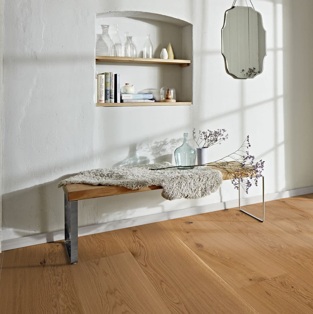 Boen Chaletino Oak Traditional Live Natural Oil 300mm is a 4 bevel plank which has been finished with live natural oil. The grade of the flooring is a mixture of natural and rustic so you will get medium to large knots which have been filled with dark brown filler. Colour variation is allowed. The oak engineered flooring comes in fixed lengths which are very long 2750mm, width of the planks is an extra wide 300mm. Total thickness is 15mm which includes the 3.5mm solid oak wear layer. There are 2 boards per pack which covers 1.65m2 and weighs 14kg per pack. Suitable for water-fed underfloor heating. Glue down only. Boen Chaletino Engineered Flooring is made in Europe and has a tongue and groove. PLEASE ALLOW 2 – 3 WEEKS FOR DELIVERY