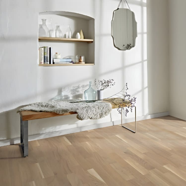 Boen 3 Strip Finale Oak Brushed Live Pure Lacquer are made with a Boen X-Press click system, enabling easier and faster installation. Each 3 strip plank is square edged so has no bevels. The oak engineered flooring comes in fixed lengths which are 2200mm long, has a 3.5mm wear layer and a total thickness of 14mm. Brushed to raise the grain and finished with Live Pure Lacquer. UK Stocked, Delivery Within 5 Working Days