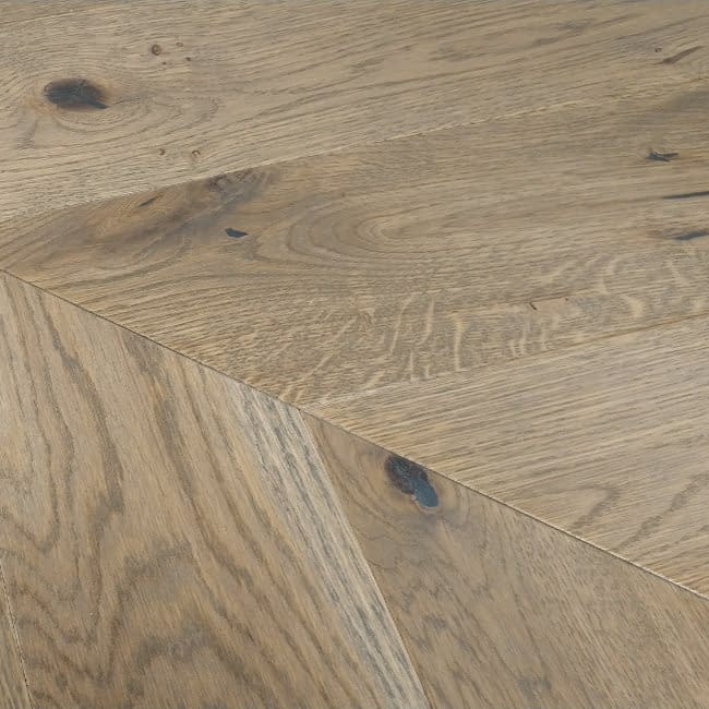 Timba Floor French Chateua Chevron Engineered Oak Flooring T&G Matt Lacquered are made with a Tongue & Groove profile. The flooring has been brushed to slightly raise the grain and coated with matt lacquer. The engineered chevron oak flooring is a Rustic Grade, this means you get a floor with a more rustic character, so each board will contain variations in colour and characteristics. Dark brown filler is used to fill any cracks ( maximum 8mm wide by 600mm long ) and dead knots ( max size 40mm ). The boards are 130mm wide. The length of the boards are 725mm long. Each pack contains 4 left hand and 4 righted boards. Weight of each pack is 5kg. It has a 2.5mm wear layer and a total thickness of 14mm. The flooring must be glued directly to the sub-floor. Suitable for Water-Fed Underfloor Heating. Top layer is European Oak. We recommend installation by a professional floor fitter. 30 Year Domestic Warranty. Engineered Chevron Fitting Instructions Recommended Cleaner is Bona Cleaner SEE LINK Use Bona Freshen Up for periodic cleaning SEE LINK Use of care agents for lacquered floors made by manufacturers other than Bona may result in staining, discolouration of floors or major changes to their slipperiness and sheen.