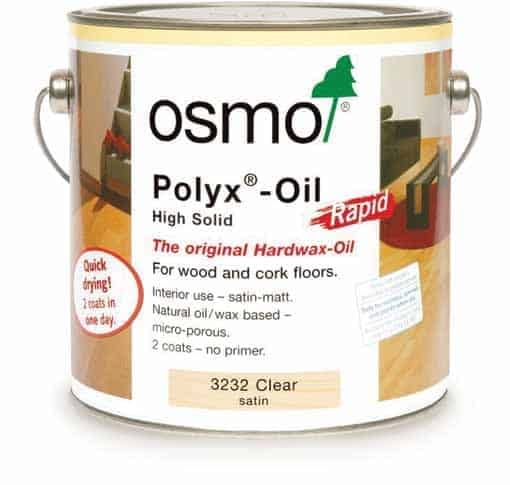 Osmo Polyx Hardwax Oil Rapid 2.5 Litres is fast drying, for all wooden and cork floors. Coverage is approx 24m2 per litre. For renovation use one coat and on bare wood use two coats. Application is by Osmo Brush or Microfibre Roller.