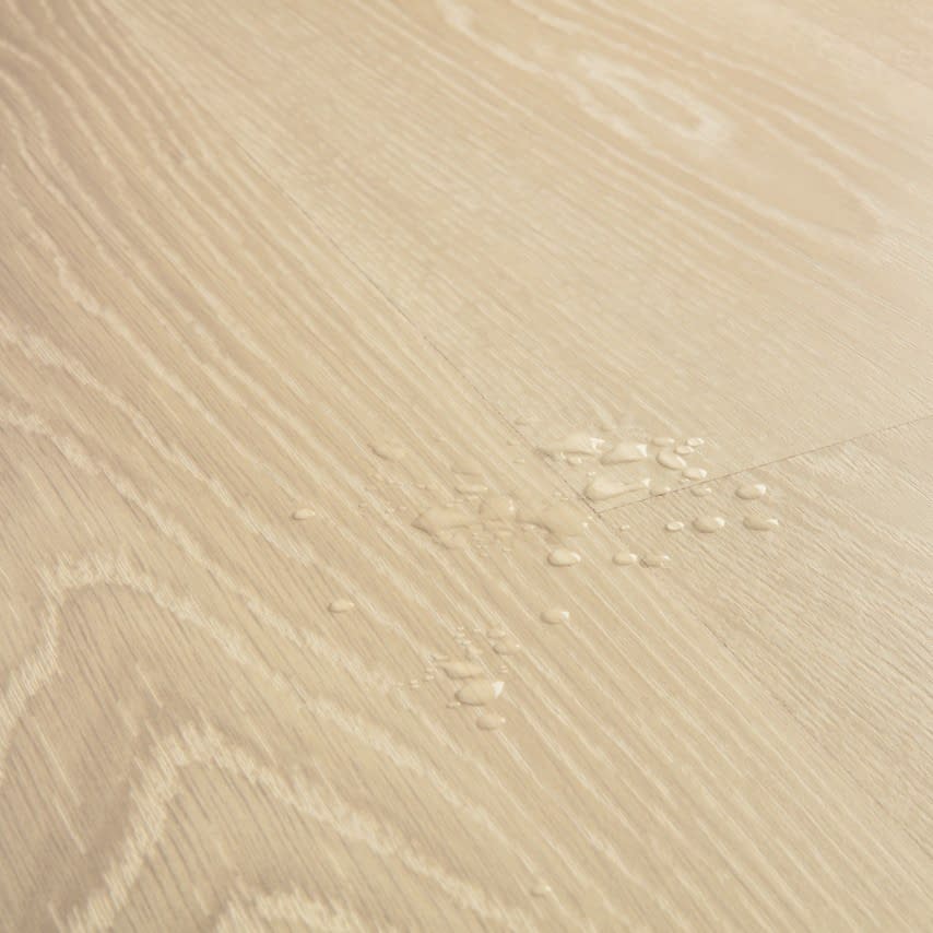 Quick-Step Classic Frosty Beige Oak (CLM5799) is a practical laminate floor that uses a light, neutral oak grain to brighten up a room. The planks have a pale beige tone with soft grey highlights, making it easy to pair with most wall colours and furniture. Unlike many traditional laminates, this specific range is designed to handle spills and moisture, so it works well in areas like kitchens or hallways where water might be tracked in.. Comes with a lifetime domestic warranty. Each board is 120cm long and 19cm wide. Also it is suitable for underfloor heating.