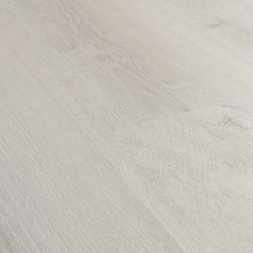 Quick-Step Eligna Venice Oak Light (EL3990) is an 8mm laminate floor that features a soft, pale oak grain with subtle grey undertones. The planks are designed without bevels, meaning there are no grooves between the boards. When fitted, this creates a completely smooth and flush surface that flows across the room, making it an excellent choice for modern interiors or smaller spaces where a clean, uninterrupted look is preferred. Each board is 1380mm long and 156mm wide. Also it is suitable for underfloor heating.