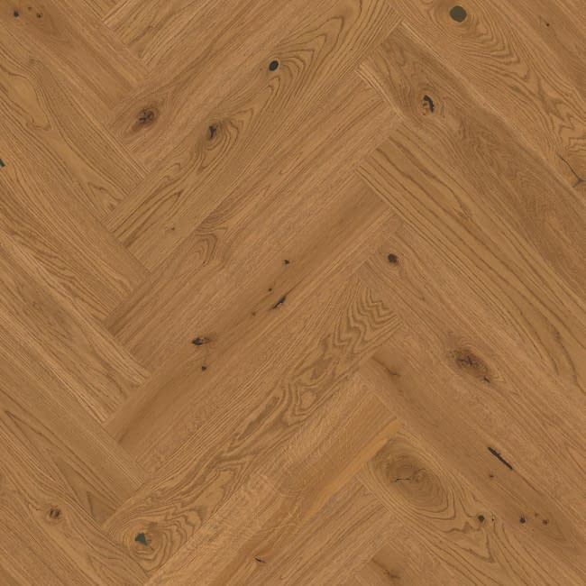 Boen Herringbone Click Honey Vivo Oak Engineered Flooring Brushed & Oiled have a 5G click joint this enables quick installation and also prevents gaps forming between the boards. The herringbone oak flooring has been slightly brushed to raise the grain and finished with natural oil. The click herringbone parquet flooring comes with half left hand and half right hand strips. The Vivo Herringbone flooring is rustic grade, so will contain small and large knots, cracked knots are filled with putty so small gaps between the putty and wood may appear. Sapwood and Heartwood are acceptable. Colour difference between boards are allowed. All grain patterns allowed. The oak engineered flooring comes in fixed lengths which are 690mm long and the widths are 138mm. The thickness is 14mm which incorporates a 3.5mm wear layer. Each pack contains 0.95m2 of A boards and 0.95m2 of B Boards. Suitable for underfloor heating. Please note that the herringbone click is not suitable to be used with other 5G click products. 25 Year Domestic Warranty. 4 Bevel. BOEN Herringbone Click is the solution that satisfies the need for both the DIY and the professional market. This is a Herringbone floor that can easily be installed by the end-consumer and professionals and are offered a choice between glued-down or floating installation.